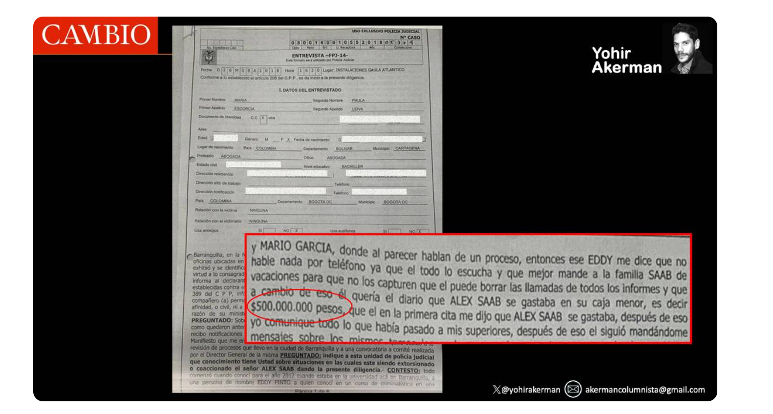“Me dice que no hable nada por teléfono, ya que todo lo escuchan, y que mejor mande a la familia de Saab de vacaciones para que no los capturen; que él puede borrar las llamadas de todos los informes y que a cambio de eso él quería lo que Alex Saab se gastaba en su caja menor, es decir, 500 millones de pesos”. La abogada informó de todo a sus superiores.