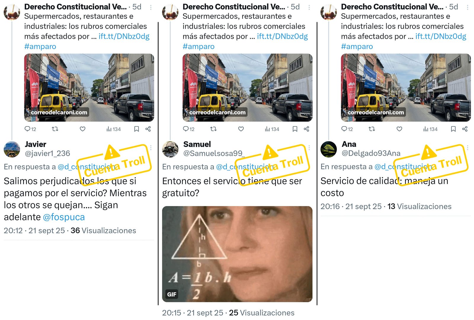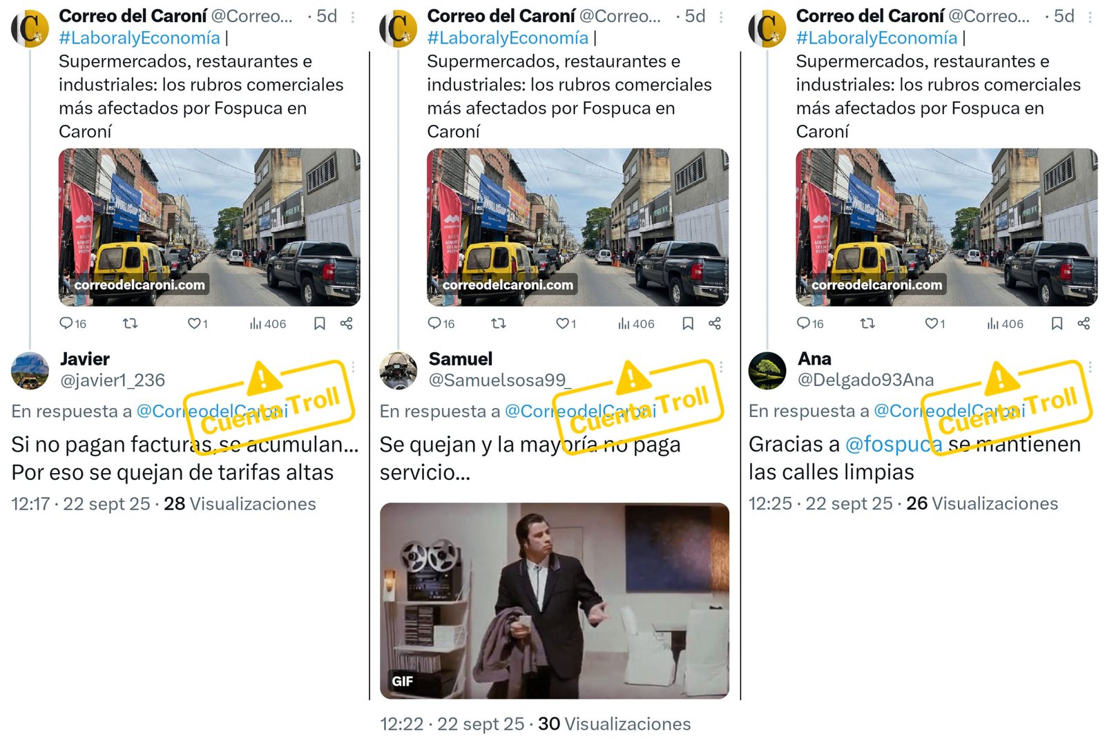 Al igual que los posteos con enlaces al artículo de Correo del Caroní, publicados tres días antes, el tuit del SNTP fue objeto de una campaña de respuestas coordinadas, muchas de ellas emitidas por cuentas troll que difunden activamente contenido favorable a Fospuca y atacan a sus críticos.