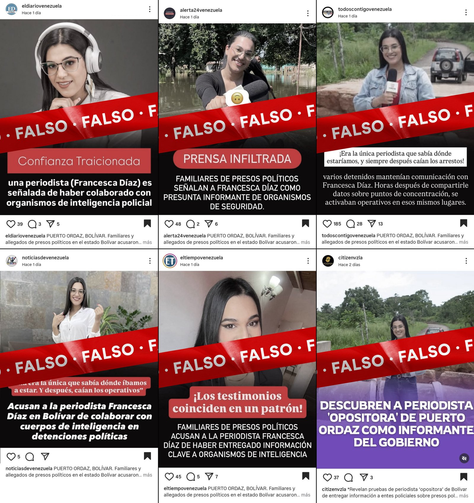 El 24 de septiembre, entre las 5:32 p.m. y las 6:09 p.m., ocho falsos noticieros en Instagram publicaron posteos difamatorios contra Díaz. Sin referirse al trabajo recientemente publicado por la periodista, intentaron posicionar el rumor de que habría filtrado información a cuerpos de seguridad en el estado Bolívar. En los primeros comentarios que aparecieron en estas publicaciones, varios usuarios desestimaron el contenido, calificándolo como un rumor sin evidencias.