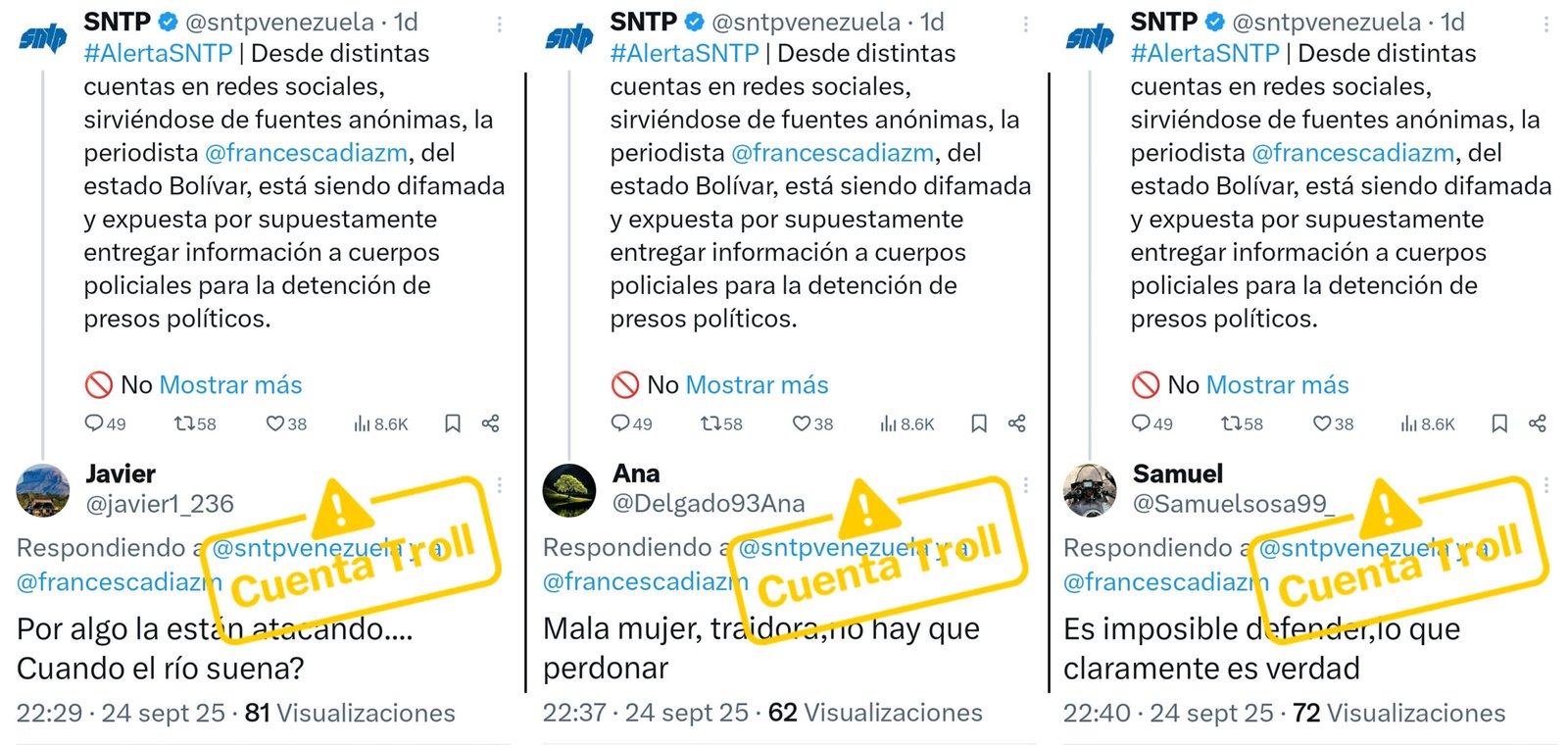 A las 7:32 p.m. de la misma noche del 24 de septiembre, el Sindicato Nacional de Trabajadores de la Prensa de Venezuela (SNTP) publicó en X una primera alerta denunciando la campaña de estigmatización en contra de Díaz.