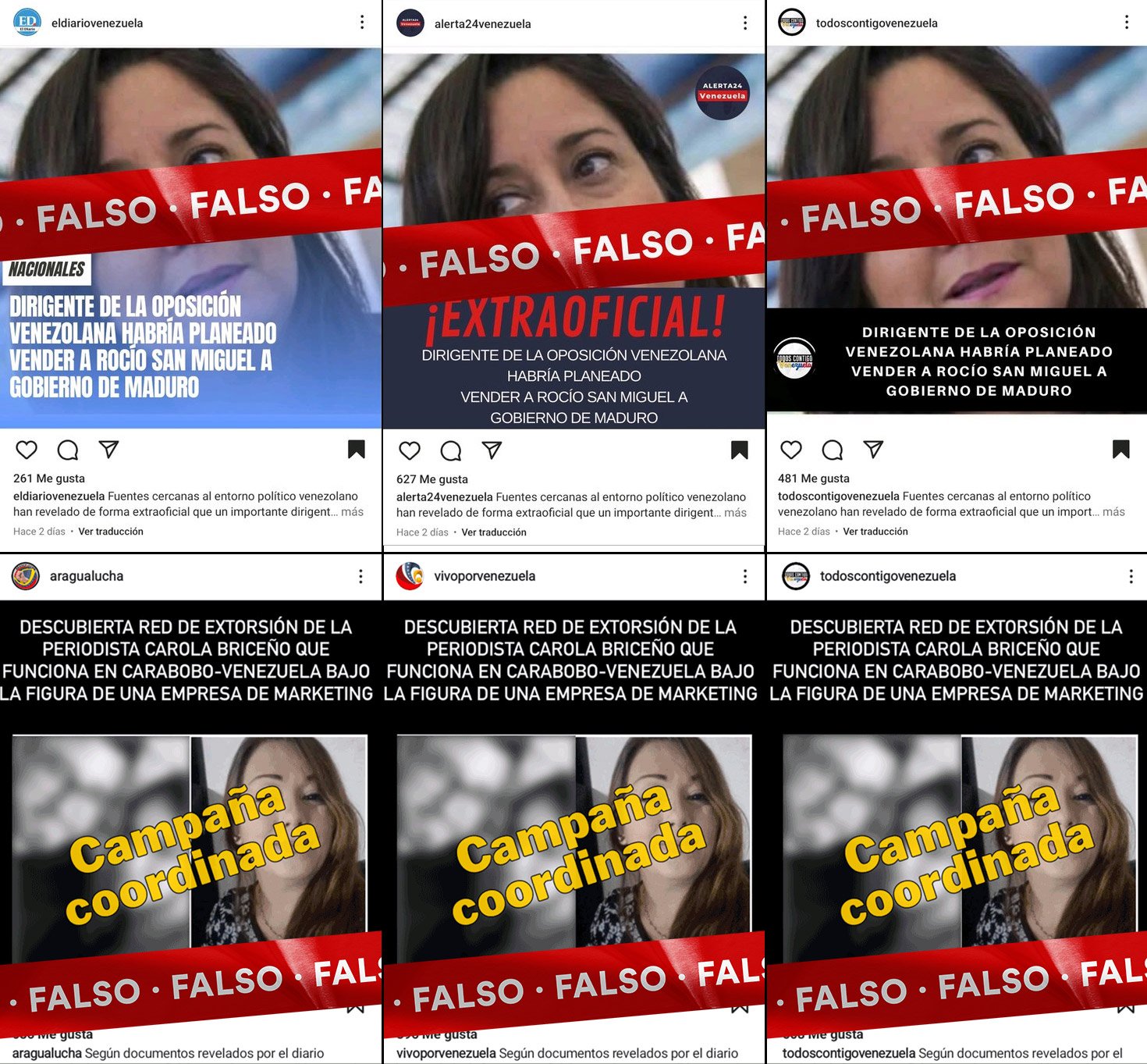 El resto de las cuentas presenta un comportamiento similar al de las ya reportadas y, en algunos casos son, de hecho, cuentas de la misma red “La Fábrica de Desinformación”, pero cambiaron de nombre de usuario para despistar: @eldiariovenezuela (antes @aragualucha), @alerta24venezuela (antes @vivoporvenezuela), @noticiasdevenezuela (antes @informativocriollo) y @prensavenezolana (antes @sucesosdevenezuela2).